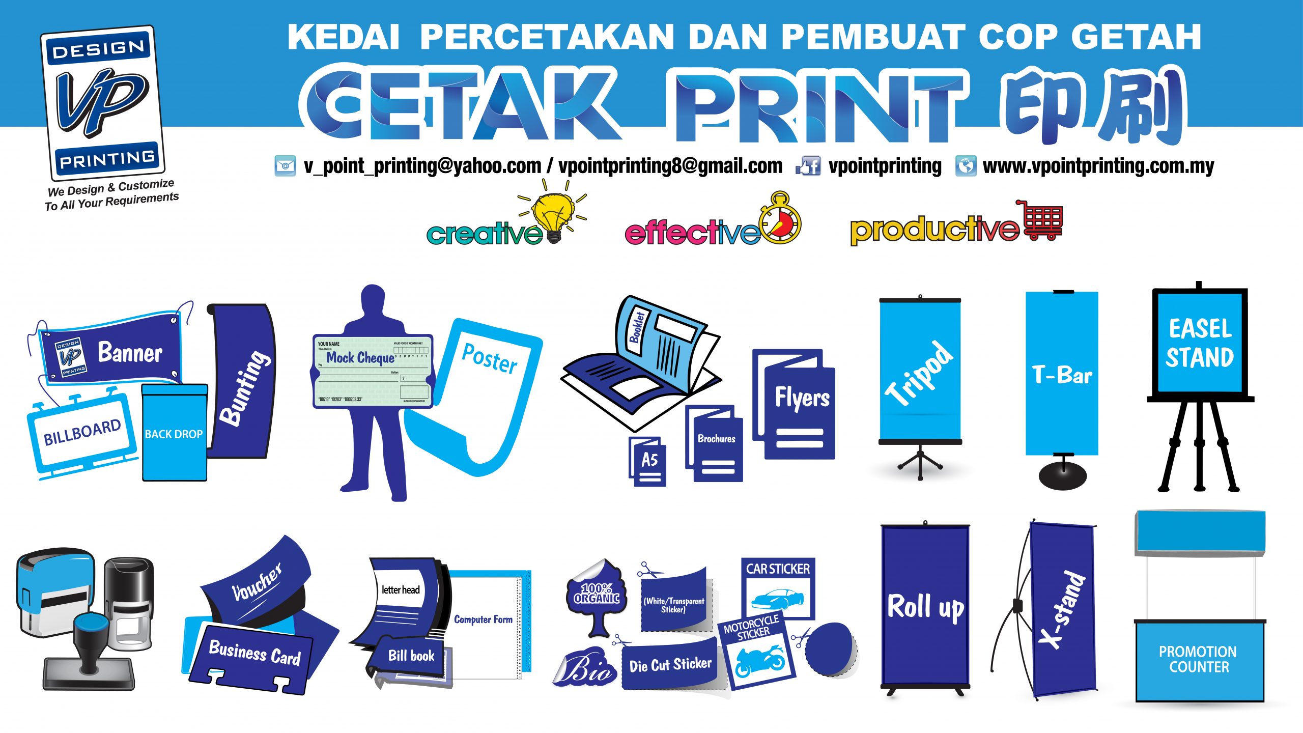 V POINT PRINTING was established in 2002. V POINT PRINTING SDN BHD (1023870-P) also known as V POINT Online Printing. We are a rubber stamp maker and speciallization in digital inkjet colour printing and offset colour printing, artwork design & advertising.